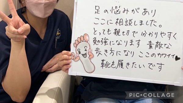 処置時間も聞きたい事や手早くわからない所にもきちんと教えて下さる所にもとても満足しております。また施術により、外反母趾の改善だけでなく、頭痛や肩こりも良くなってきています。体の不調の原因は足(歩き方)なんだなあ、とつくづく感じています。
